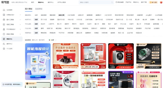 易可图是一款汇集了大量设计模板及AI工具的在线设计平台,针对电商行业地应用做了大量的功能来支持,而易可图的模板中心就可以用来做主图水印。